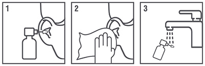 Postopek ponovite še na drugem ušesu. Po vsaki uporabi splaknite nastavek pršila s toplo vodo.